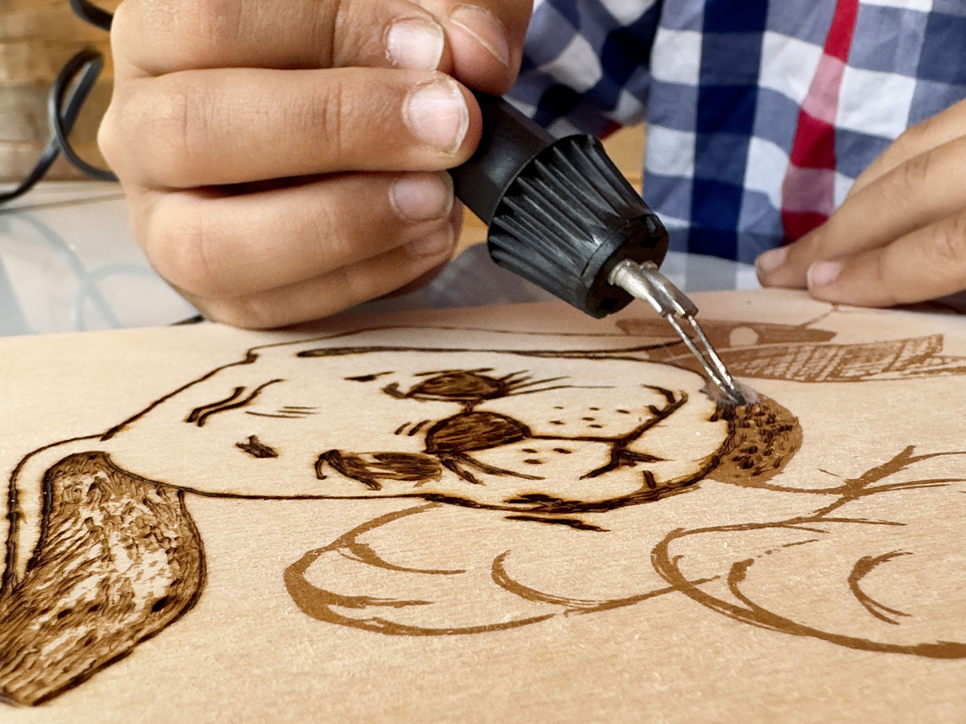 Brandmalerei ist die Kunst, mithilfe eines erhitzten Metallstifts oder Brennkolbens Muster und Werke auf Holz oder sonstigen Materialien zu brennen. Die Technik erfordert Präzision und Geduld, da die Schattierung und Tiefe des Werkes durch die Temperatur des Werkzeuges und die Dauer des Kontaktes mit der Oberfläche gesteuert werden. Beim Brennen verbessern die Teilnehmer ihre zeichnerischen Fähigkeiten, schulen die Feinmotorik und vertiefen ihre künstlerischen Kenntnisse.
